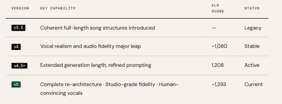 The jump from v4.5+ to v5 isn't incremental refinement, it's described internally as a complete re-architecture. The ELO score gap (85 points) reflects a material improvement in how listeners actually perceive the output, not just on paper benchmarks.