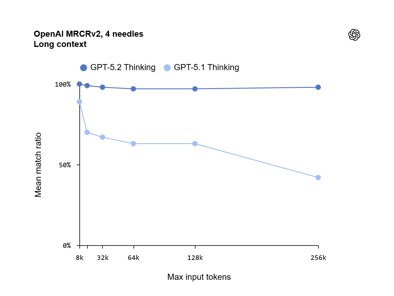 vs GPT-5.1: GPT-5.2 delivers dramatic gains in long-context accuracy (77% vs. 29.6% at 256K), coding (55.6% vs. 50.8% on SWE-Bench Pro), and tool reliability (98.7% vs. 95.6% on Tau2 Telecom). Hallucinations are 30% less frequent, and output quality is consistently more professional.