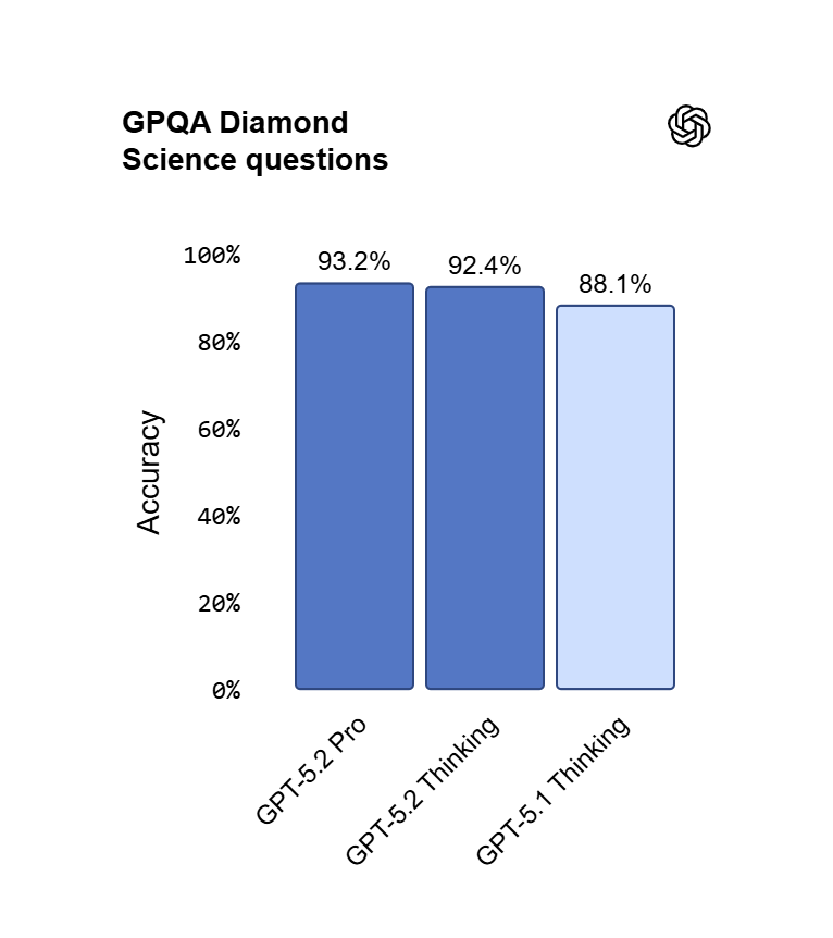 vs GPT‑5.2 Thinking: GPT‑5.2 Pro delivers higher accuracy on elite benchmarks like GPQA Diamond (93.2% vs. 92.4%) and ARC-AGI-1 (90.5% vs. 86.2%). Optimized for maximum reasoning depth (xhigh effort), making it better suited for scientific and theoretical work, while Thinking targets professional productivity with faster turnaround.